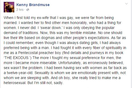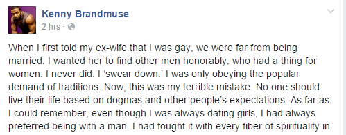 HIV positive Nigerian Kenny Brandmuse reveals he’s gay Posted by: b3rrilyn in Celebrity News Jan 8, 2015 According to Kenny, he used to be married. Even told his ex-wife about his being gay way before they got married and she still went ahead with the marriage. Read his post on Facebook below: Kenny Badmus 2015-01-08 b3rrilyn