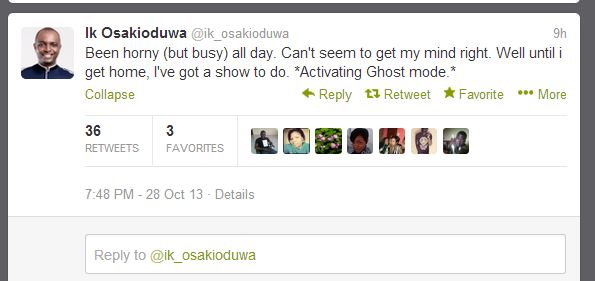 TV personality IK Osakioduwa must have had a not-too-good Monday. The BBA Host tweeted about being busy but horny throughout today but can’t wait home to get home and get started, with his wife of course. Mind you IK is a funny guy so don’t take it all that serious. Would you want your man to tweet this?