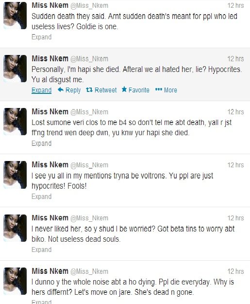 A Nigerian girl with twitter handle @miss_nkem tweeted a few hours ago about Goldie‘s death.