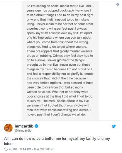 Cardi B felt the heat and decided to address the situation plus take responsibility for her actions.