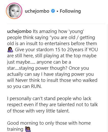 Uche JomboNollywood actress, Uche Jombo recently revealed what he thinks about people who lack respect and misbehave on the internet.
