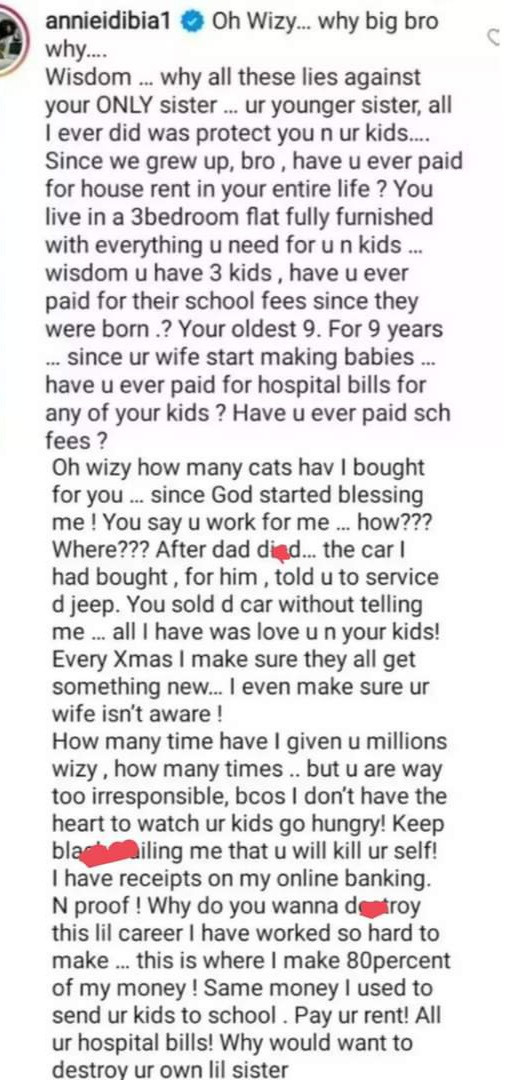 According to Annie, what her brother is saying is simply not true because she has done a lot of things for him and her family members, and she doesn’t know why he would want to drag her down.