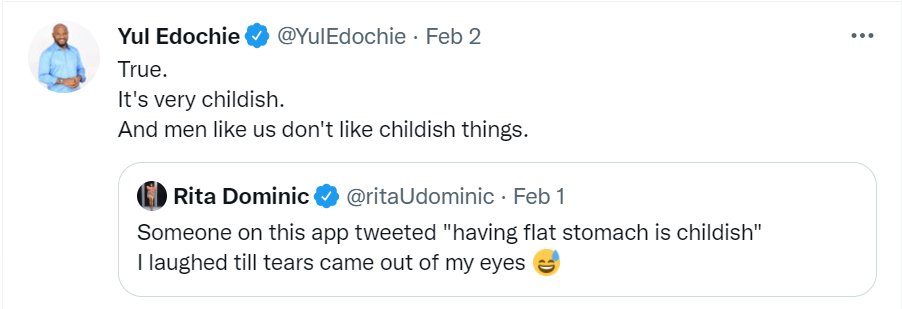 According to him, Rita Dominic is wrong to have a contrary opinion and men like him will have to avoid such childish things.