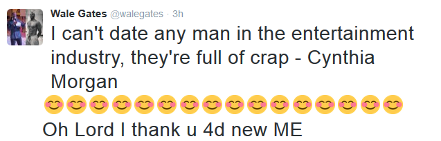 Comedian Wale Gates tweeted about Cynthia Morgan‘s statement on Rubbin Minds with Ebuka, in which she said can’t date any Nigerian entertainer because they are full of crap..