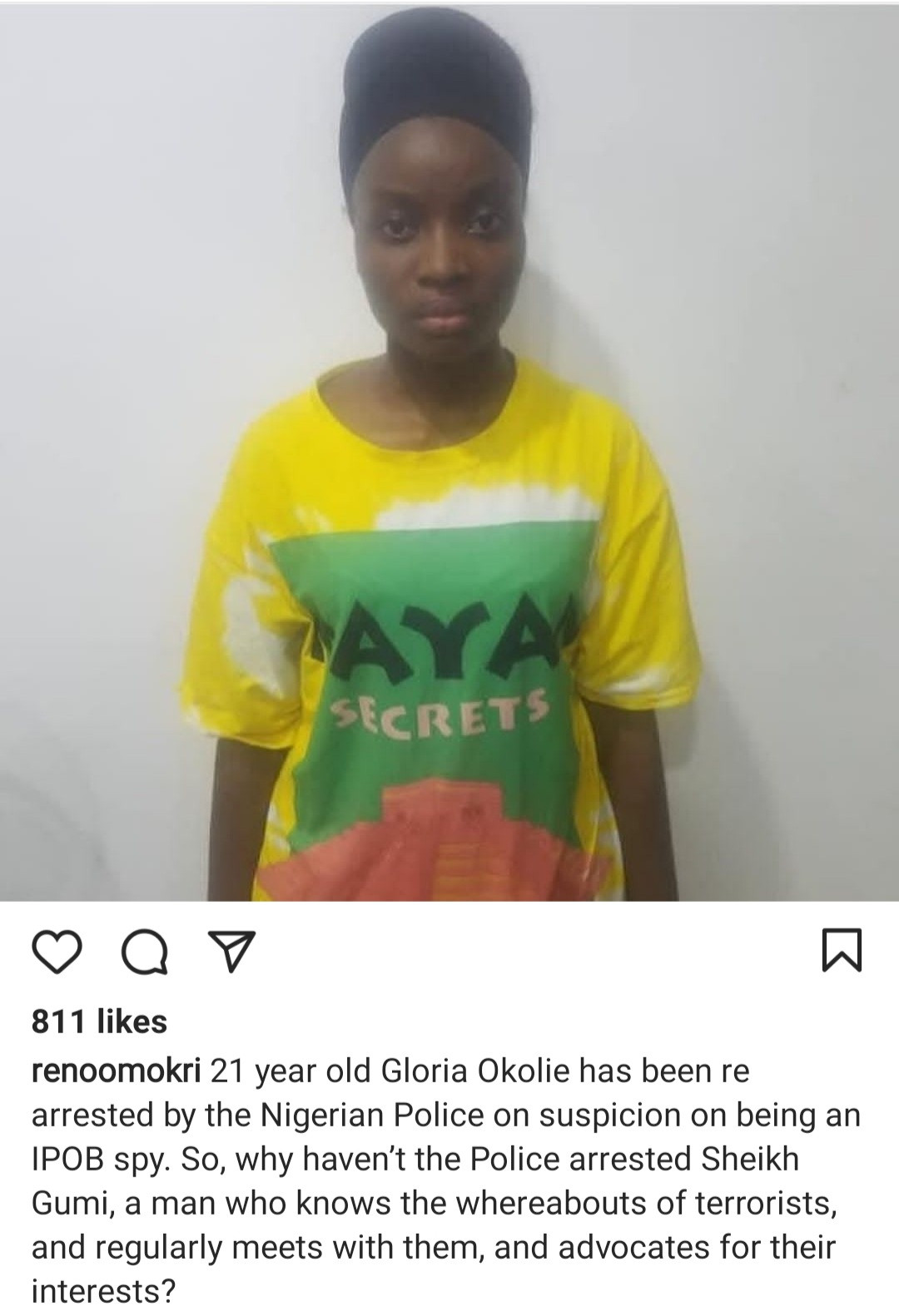 According to him, he doesn’t understand why Gloria has been arrested over allegations that she is an IPOB spy, yet Sheikh Gumi who meets with bandits and negotiates on their behalf has never been arrested.