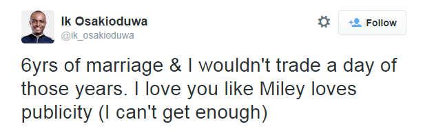 Ik Osakioduwa and wife celebrate wedding anniversary with romantic words Posted by: b3rrilyn in Celebrity News Oct 3, 2014 OAP and Tv host is celebrating his sixth wedding anniversary with his wife….with the high rate of divorce this is worth celebrating. Congrats to them Ik Osakioduwa 2014-10-03 b3rrilyn
