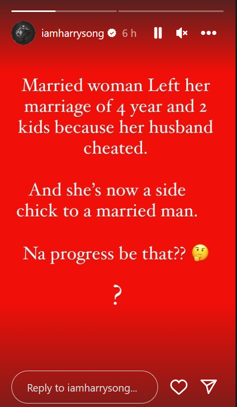 Harrysong added that he does not understand why a married woman would dump her husband to become the side chick of another married man.