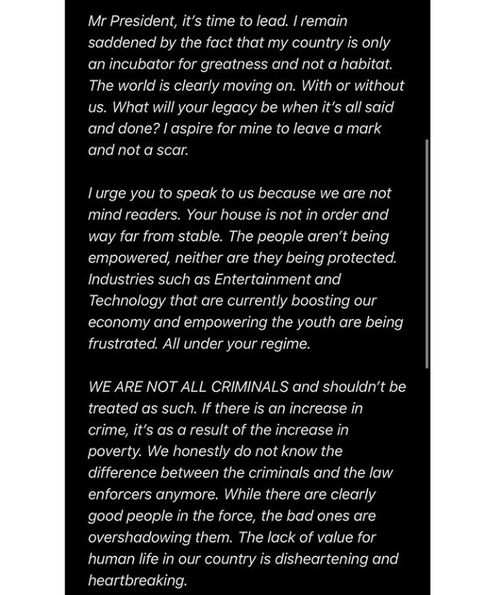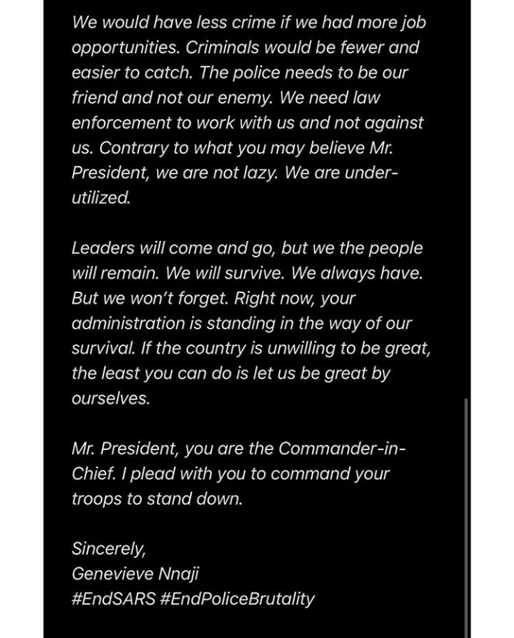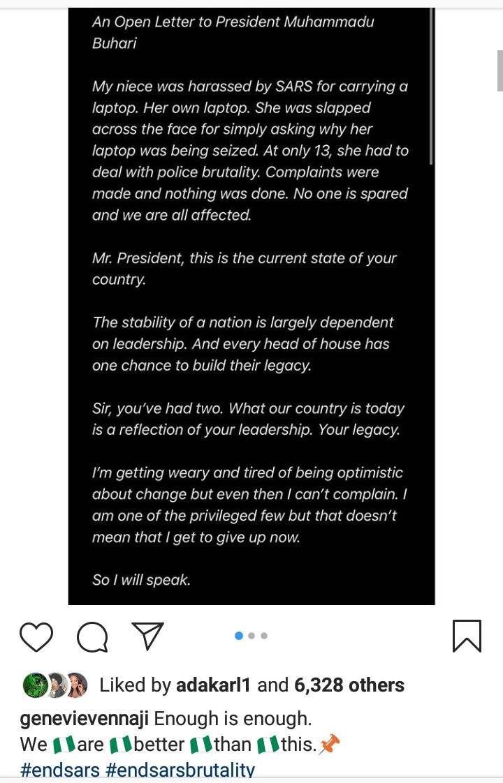 Her words, “Enough is enough. We are better than this. #endsars #endsarsbrutality.”