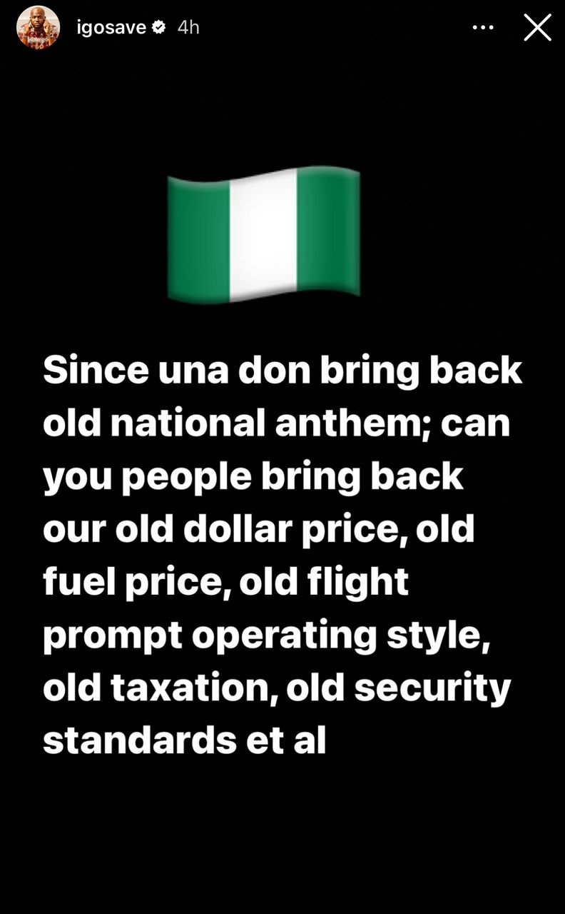 According to him, since the Federal government has reverted to the old national anthem amid these trying times, it is best to also revert to the old petrol price, old dollar price, old taxation and old security standards.