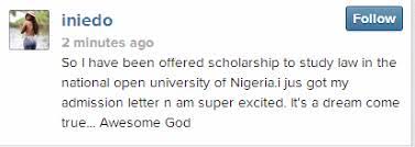 Ini Edo offered Law Scholarship, flaunts admission letter Posted by: b3rrilyn in Celebrity News May 15, 2014 Ini Edo just got her admission letter from (NOUN).. She was with fellow actor turned Lawyer, Kenneth Okonkwo Ini Edo NOUN 2014-05-15 b3rrilyn