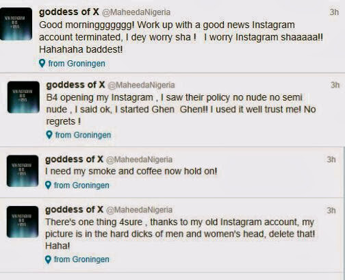 Hours after she shared her nude pics, Instagram threw her out. Maheeda‘s tweets continue after the cut.
