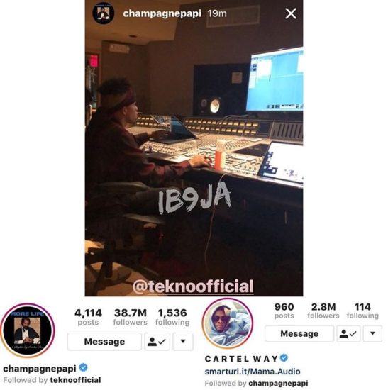 Drake however made a post on snapchat, of a picture of Tekno taken during a studio session.