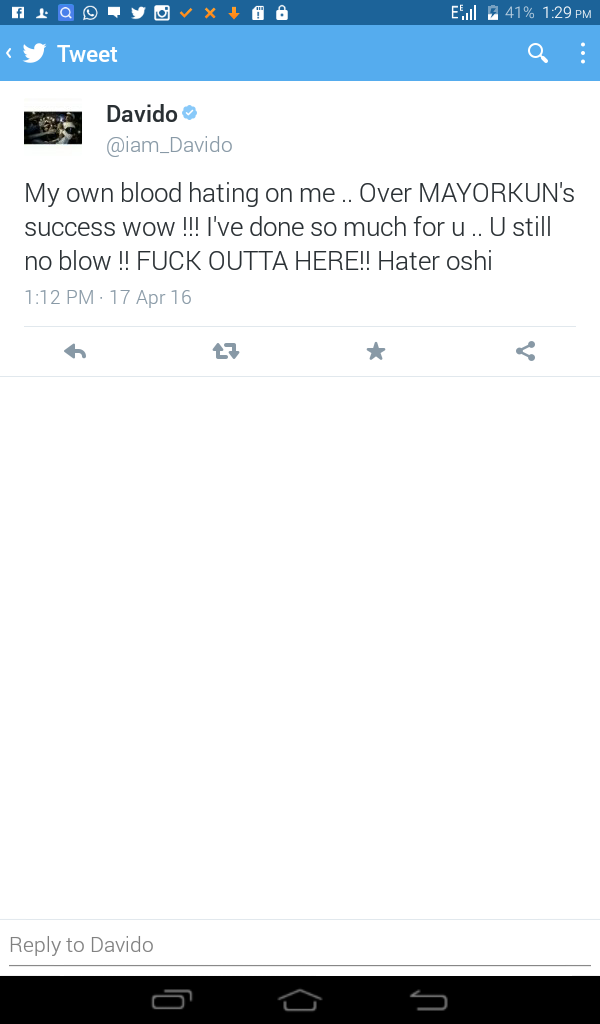 Davido announced that his new artiste Mayorkun made a mark into the music industry with his new song ‘Eleko‘ and in 10 days the video got 1 million views, Davido took to twitter to reveal that his own ‘blood’ is hating on him over the success of the new HKN boy, Mayorkun.