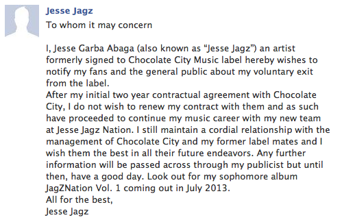 After my initial two year contractual agreement with Chocolate City, I do not wish to renew my contract with them and as such have proceeded to continue my music career with my new team at Jesse Jagz Nation. I still maintain a cordial relationship with the management of Chocolate City and my former label mates and I wish them the best in all their future endeavors. Any further information will be passed across through my publicist but until then, have a good day. Look out for my sophomore album JagZNation Vol. 1 coming out in July 2013.