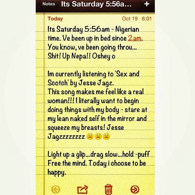 Jesse Jagz’s “Sex & Scotch” makes me want to squeeze my breasts – Eva Alordiah Posted by: b3rrilyn in Celebrity News Oct 20, 2013 Below is what the singer shared on her Instagram page Eva Alordiah Jesse Jagz 2013-10-20 b3rrilyn