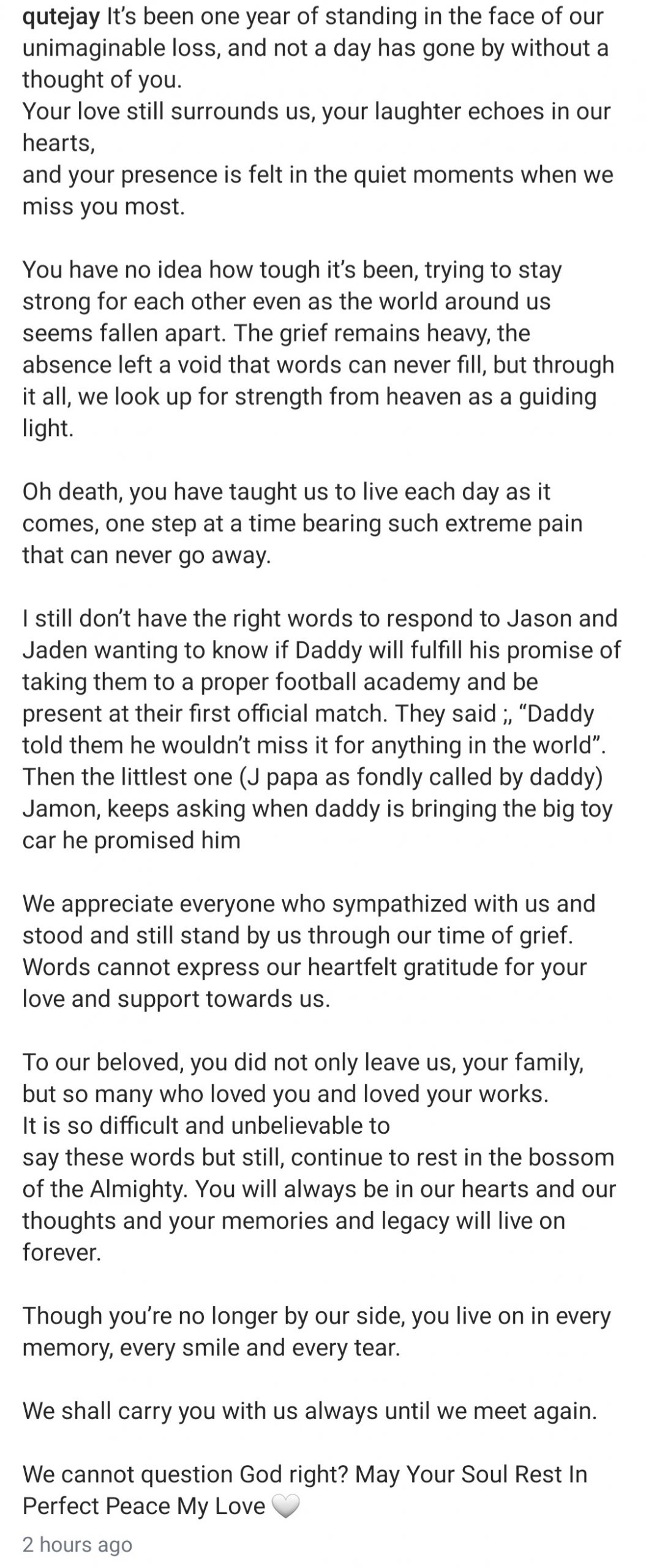 Jennifer added that the grief remains heavy, and his absence has definitely left a void that words can never fill.
