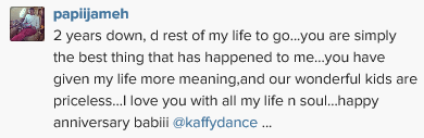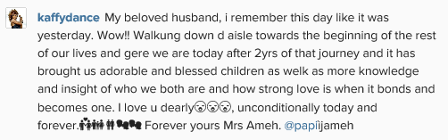 Kaffy and Joseph Ameh tied the knot on June 2nd 2012 in Lagos. The couple sent lovely messages to each other on Instagram to mark the day. Congrats to them.