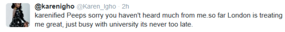 BBA winner Karen Igho is now a student of a university in the UK. Karen is now a student of Business Administration and Management for three years at Newham University. Then another Masters course in Arts for one year. Good one