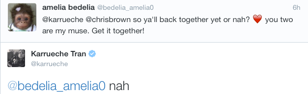 There were reports some days ago that Chris Brown and his long suffering on/off-again girlfriend Karrueche Tran were back together after they were spotted in the same place at the same time on at least two occasions over the weekend. When a fan asked Karruehce if she was back with Chris, she set the record straight.