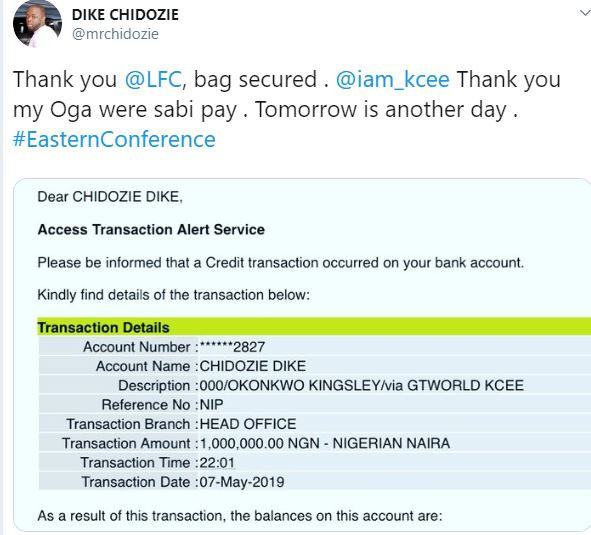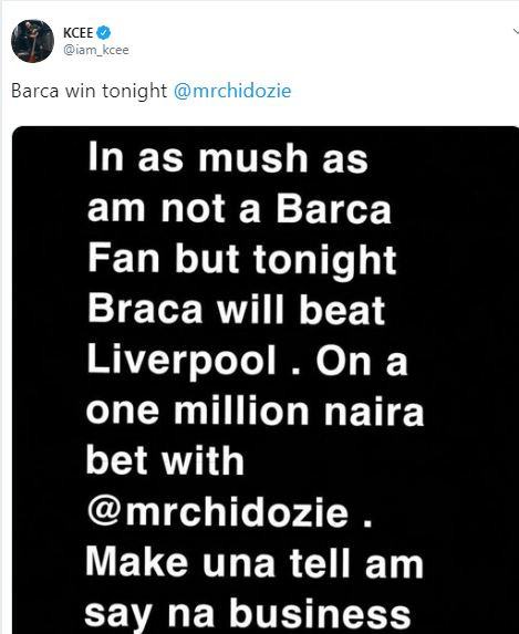 Before the game, Kcee had vowed to give one million naira to @mrchidozie, who is a Liverpool fan if the English team won the game and qualified.