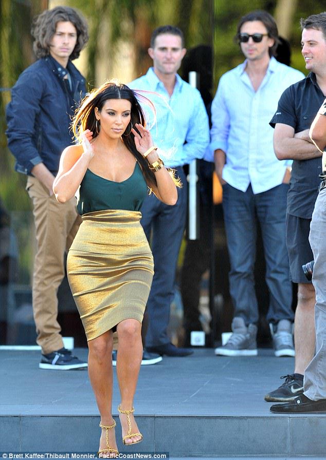 Looking hot as usual, the 32 year old was dressed in a green low-cut top and gold fitted skirt that she paired with her favorite Tom Ford strappy sandal stilettos and gold jewelry.