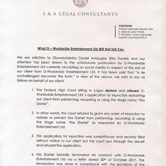 Kiss Daniel was dragged to court by the management of G-Worldwide Entertainment, for allegedly breaching the seven years artiste management deal he signed with the record label in 2013.