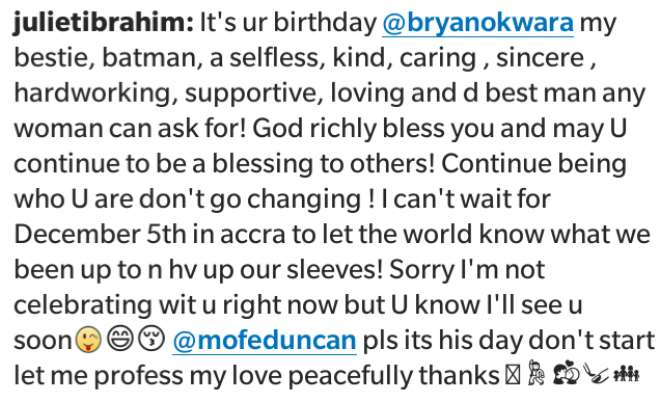Kiss of life!! Juliet Ibrahim wishes Bryan Okwara happy birthday Posted by: b3rrilyn in Celebrity News Nov 9, 2014 They have both denied being in a relationship but she has sent him this romantic message for his birthday with the photo collage above. We hope the photo of them kissing is a movie o. Lol Bryan Okwara 2014-11-09 b3rrilyn