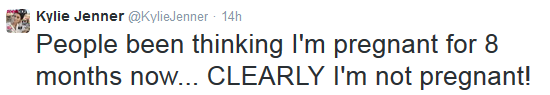 Kylie Jenner denies being pregnant Posted by: b3rrilyn in Celebrity News May 28, 2015 The Keeping up with the Kardashian star who is 17 and dating rapper Tyga has been in the news often lately. It was speculated that she is pregnant and also engaged to Tyga. She has shut down such stories with these tweets kyli jenner 2015-05-28 b3rrilyn