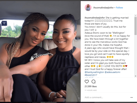 Linda Ejiofor, took to Instagram to pen down a lovely message to her friend Adesua Etomi whose white wedding is holding today.