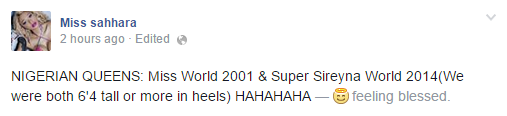 Miss Sahhara and Agbani Darego at the Miss World Pageant Posted by: b3rrilyn in Celebrity News Dec 16, 2014 Miss Sahhara shared these photos of herself with ex Miss World Agbani Darego at the pageant’s finale on Sunday. Agbani Darego Miss Sahara 2014-12-16 b3rrilyn