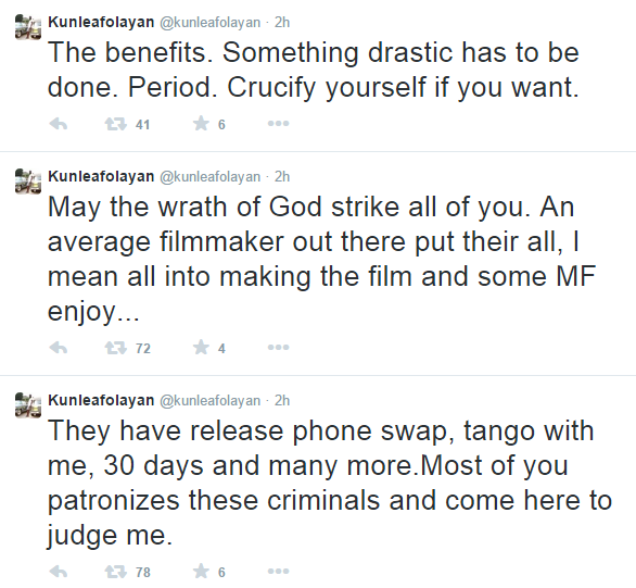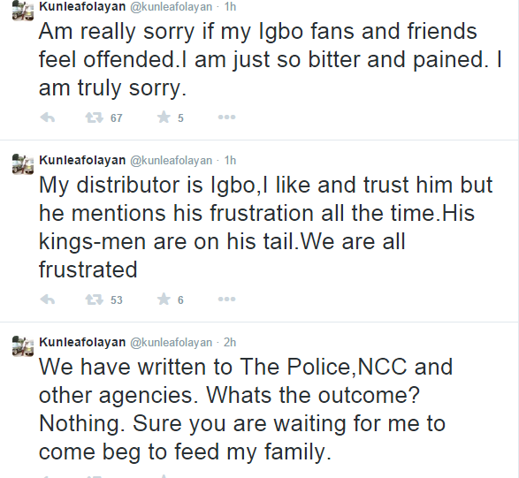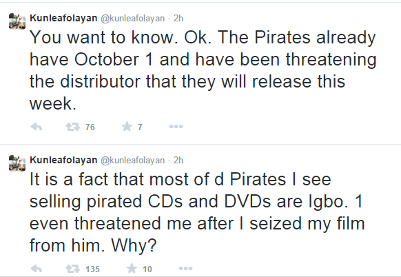 Kunle released his movie October 1 last year and has since been pirated. According to him Igbo people are responsible for this and hence the wrath of God will strike all of them.