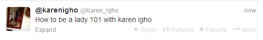 Karen Igho took to her twitter page to give you tips on how to be a lady. Calls it “How to be a lady 101 with Karen Igho”