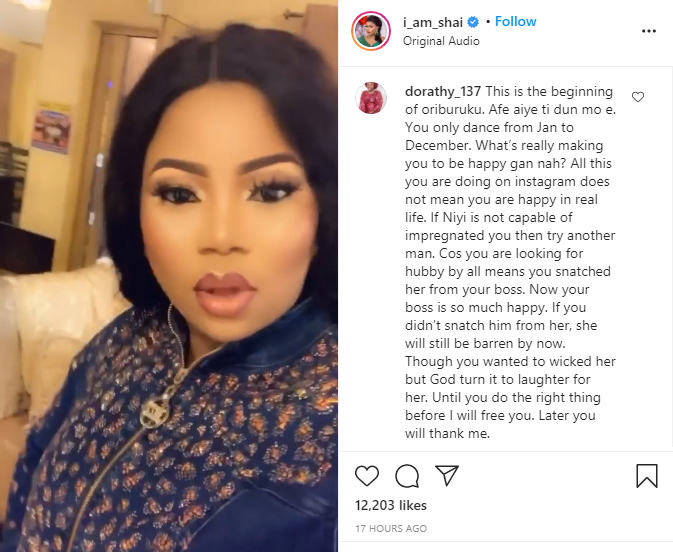 The troll wrote, “This is the beginning of oriburuku. Afe aiye ti dun mo e. You only dance from Jan to December. What’s really making you to be happy gan nah? All this you are doing on instagram does not mean you are happy in real life. If Niyi is not capable of impregnated you then try another man. Cos you are looking for hubby by all means you snatched her from your boss. Now your boss is so much happy. If you didn’t snatch him from her, she will still be barren by now. Though you wanted to wicked her but God turn it to laughter for her. Until you do the right thing before I will free you. Later you will thank me.”
