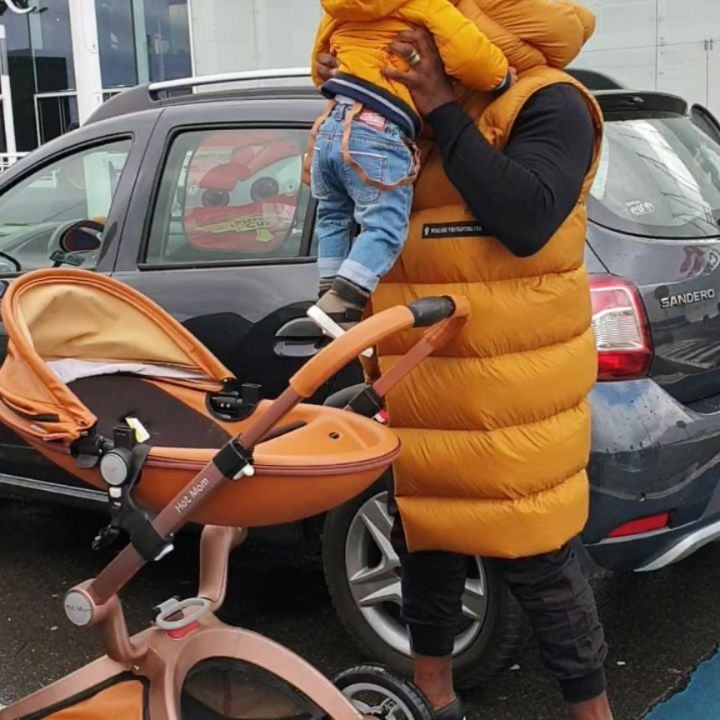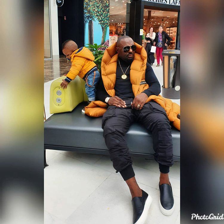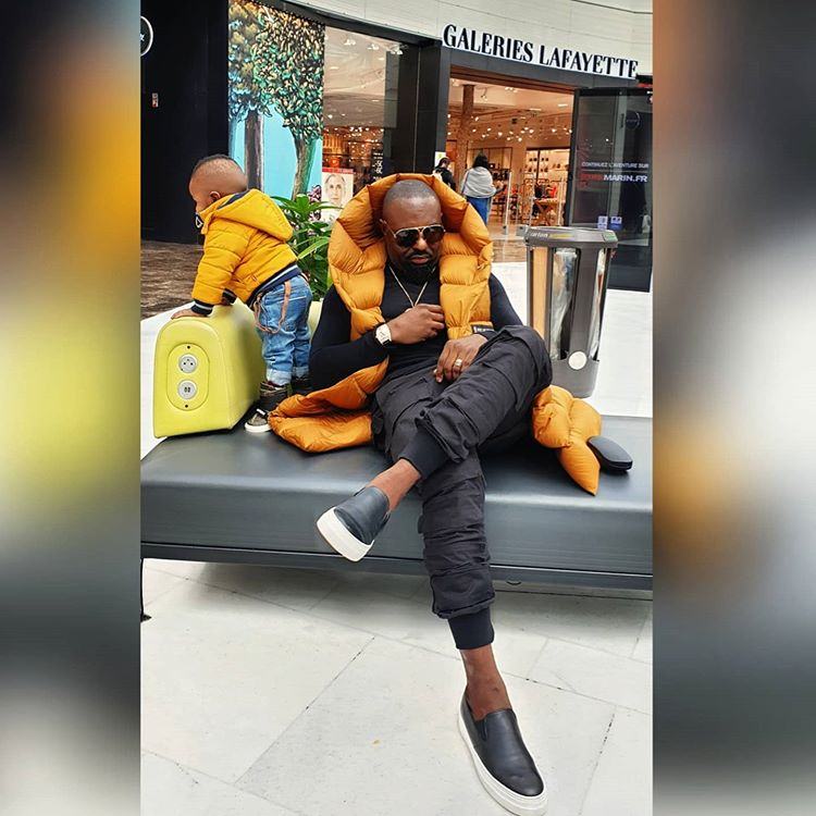 Rocking an all-black outfit and a yellow coat, his son wore a blue jean with a matching color of coat as his father.
