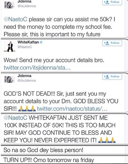 A fan going by the Twitter handle ‘Jidenna’, tweeted at Naeto C, asking if he could help with his tuition fees and it must have come as a shock to him when the rapper responded.