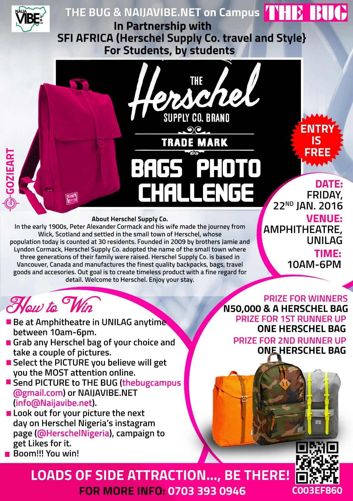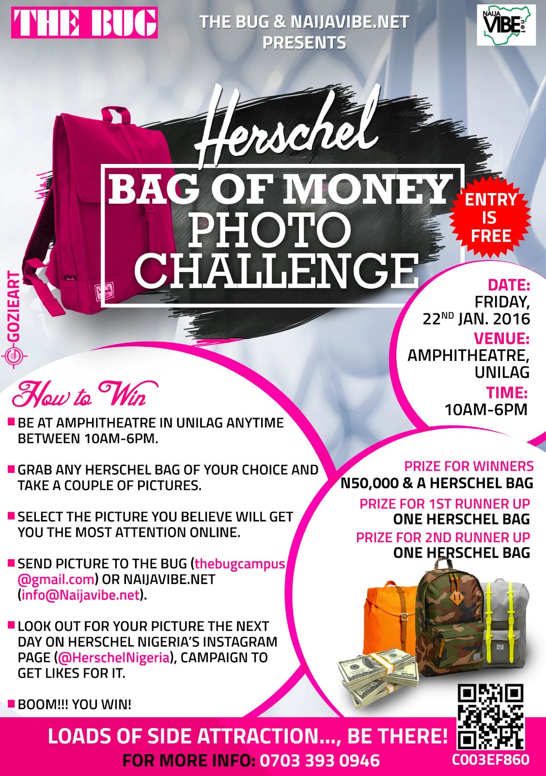 Naijavibe.net is collaborating with The Bug magazine to excite students in Lagos State in what is captioned: “Herschel Bag of Money Photo Challenge”. The event which is billed for 22nd January 2016, will take place in Amphitheatre within UniLag main campus between the hours of 10am to 4pm.