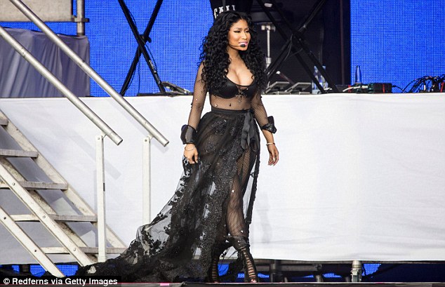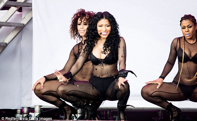Nicki Minaj let it all hang out as she flashed her body at a performance, at a music festival in Denmark. The star wore just a tiny black bra and a black thong with see-through black netting covering her arms and legs as she twerked and danced for the crowd.