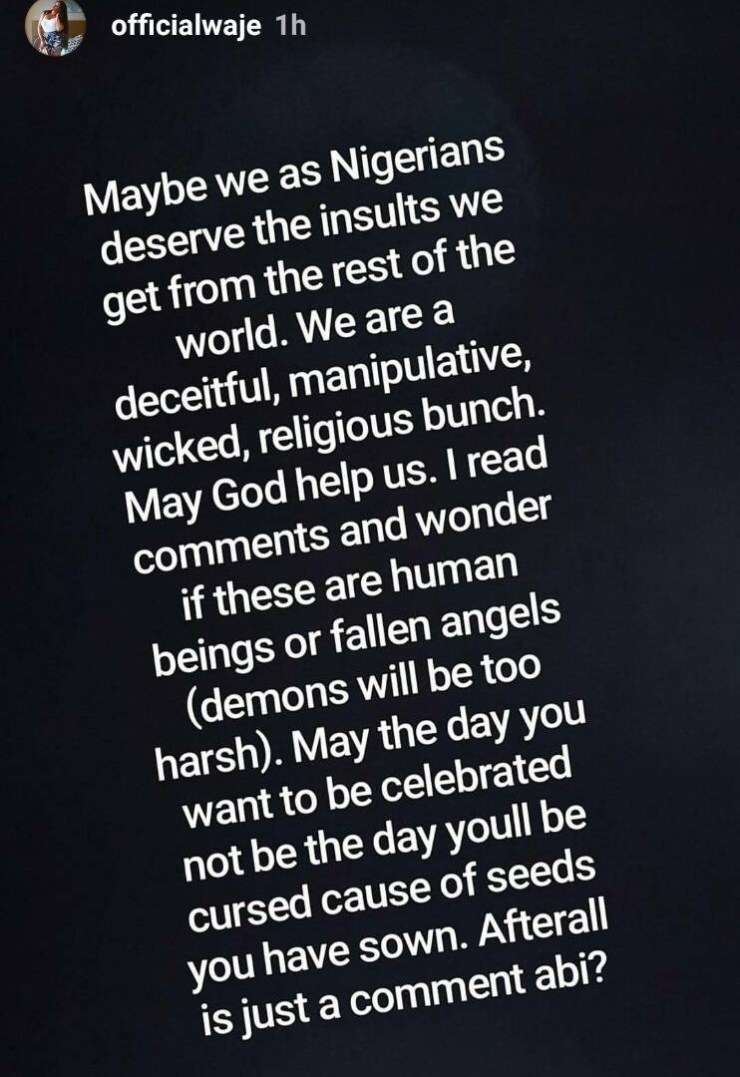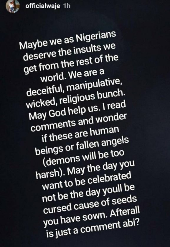 Home » Celebrity News » “Nigerians are deceitful, manipulative and wicked” – Singer, Waje