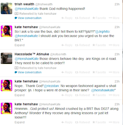 The actress tweeted this a few minutes ago Hmmmm.. God protect us! Almost crushed by a BRT Bus D027 along Anthony! Wonder if they receive any driving lessons or just let loose!!!
