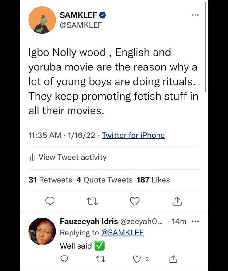 According to him, Nollywood promotes a lot of fetish stuff in their movies and they can definitely do better as everything is not religion or juju.