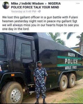 “We lost this gallant officer in a gun battle with Fulani hesmen yesterday night rest in peace my gallant Sgt we will always miss you in our hearts hope to see you one day in the lord”