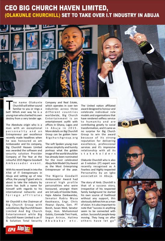 The magazine which has continued to receive positive rave since its inception features Nigeria’s Youngest Entrepreneurs, Big Church Haven Limited, Olakunle Churchill, Nigerian reggae star Cynthia Morgan, Mr. Lucky Igbokwe wedding and Queen Judith Okwunodu, miss Ambassador for peace Nigeria.