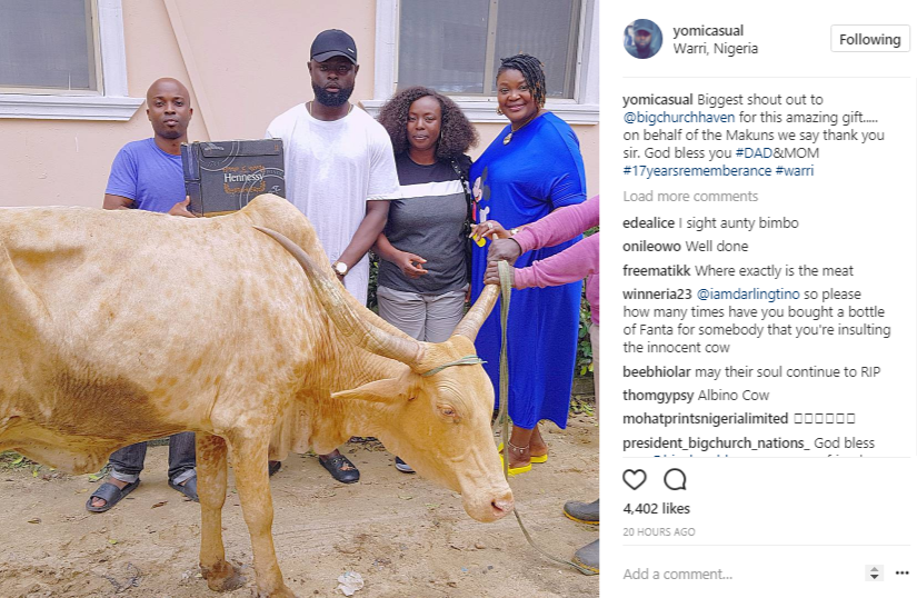 The Makuns got a fat cow from Tonto Dikeh’s ex husband, Olakunle Churchill for their late parents’ 17th year remembrance.