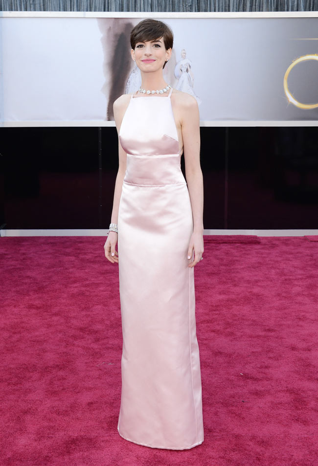 The winner of Best Supporting Actress for her role in Les Miserables Anne Hathaway was sweet in a blush pink Prada dress with a strategically open back and sexy sides.