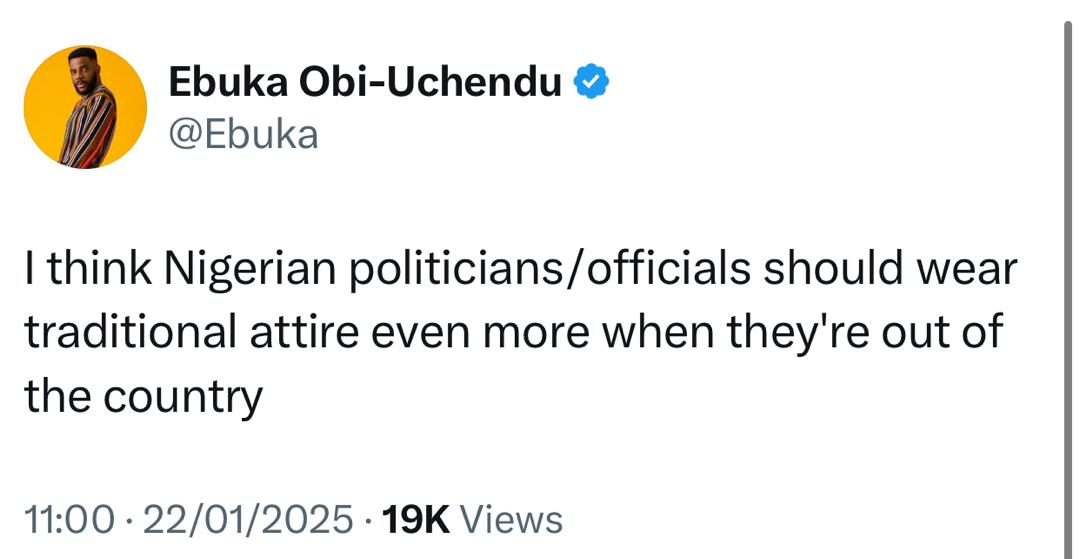 According to him, he believes Nigerian politicians should rock their traditional outfits more outside the country because it is a clever way to flaunt their culture back home.