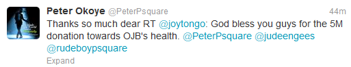 Peter, Paul and Jude Okoye donate N5million to OJB Posted by: b3rrilyn in Celebrity News, GIST Jun 28, 2013 God bless them. Jude Okoye OJB PSquare 2013-06-28 b3rrilyn