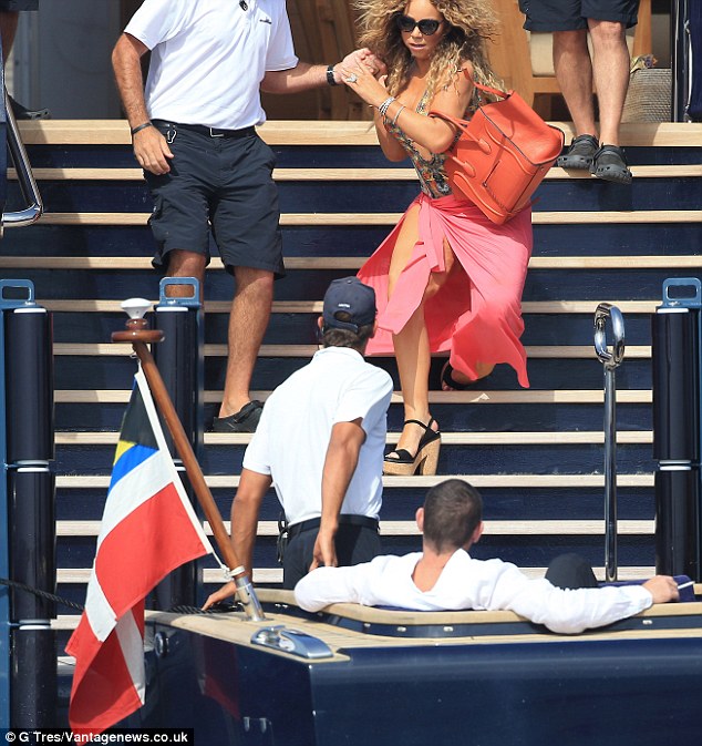 Yesterday, Mariah Carey nearly tumbled down the steps as she arrived on board her new billionaire boyfriend’s yacht …The interesting thing is, the 47 year old James Parker just sat there all through her near embarrassing moment, not even flinching as the other men on deck rushed to her aid..