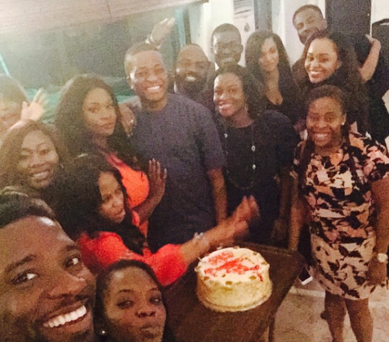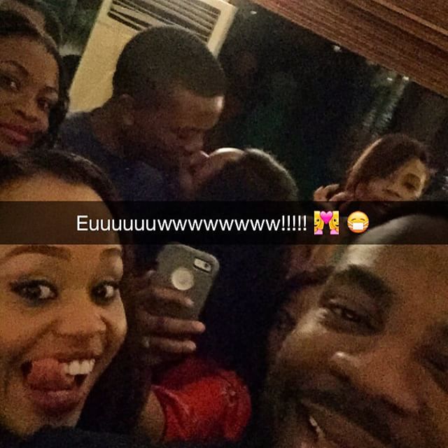 OAP Toolz and her fiance Tunde Demuren pictured in the background kissing at her birthday dinner yesterday evening. Friends of the bootylicious media personality threw her quiet birthday dinner at a restaurant in Lagos. Ebuka Obi Uchendu and his fiancee, Gbemi Olateru-Olagbegi, Lamide Adedeji and wife were among the guests.