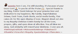 Pictures from Sunmbo Adeoye’s birthday party Posted by: b3rrilyn in Celebrity News Nov 24, 2014 Pastor David Adeoye’s wife, Adesunmbo turned 33 over the weekend and she had a fun party to celebrate today. Pictured above is the beautiful birthday gurl and mum of two with hubby Sunmbo Adeoye 2014-11-24 b3rrilyn