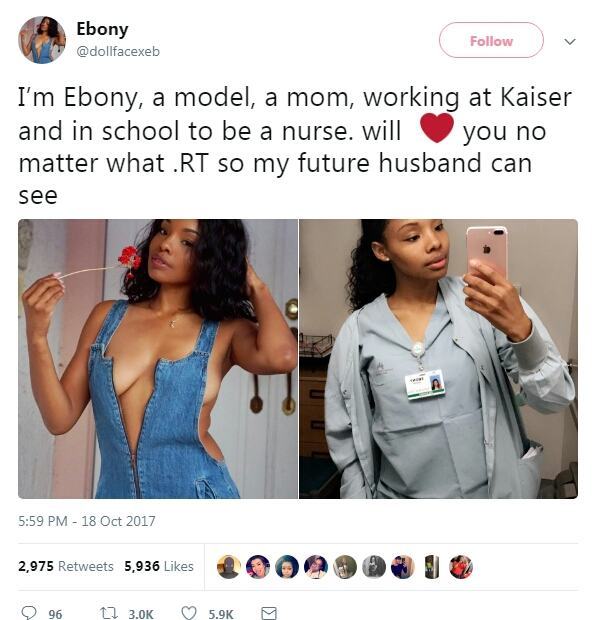 The search for Mr Right just got more real and creative. This beautiful lady with id, Ebony (@dolifacexeb) went on twitter searching for her missing rib. She canvassed for Retweets so her future husband can see her.